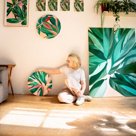 Danii feels most at home when painting botanicals such as house plants, flowers or foliage and combining them with strong female forms. In her work, she strives to capture the joy and freedom of self-expression through the use of bold, colourful and dynamic forms.